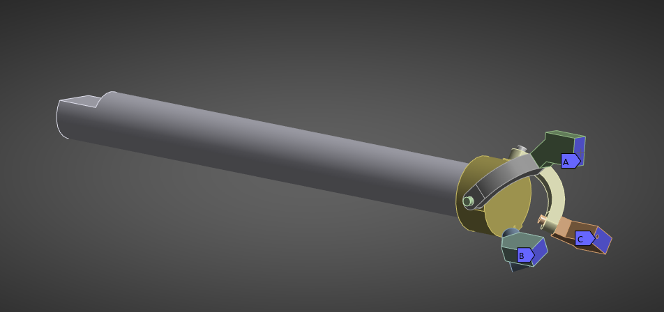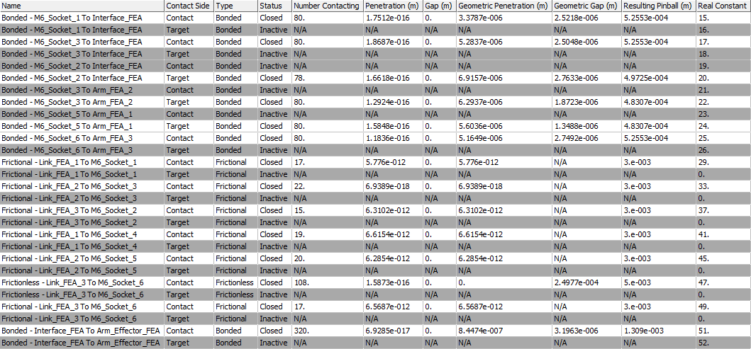 Arm cylinder to end-effector = bonded. Pure Penalty Formulation is used because the end effector has other bonded contacts at the threaded holes. If MPC was used here an over constrained condition occurs.